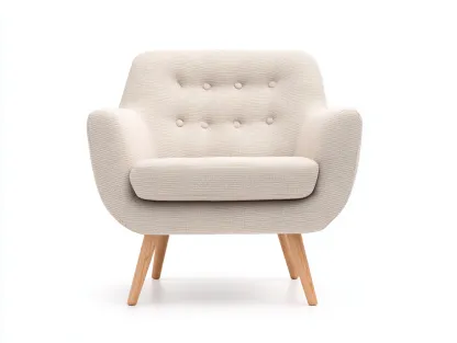Powierzchnię mebla pokryto trwałą tkaniną w kolorze jasnego beżu o przyjemnej strukturze. Drewniane nogi w naturalnym odcieniu zapewniają stabilność oraz estetyczne wykończenie. Pikowane oparcie z dekoracyjnymi guzikami podkreśla stylowy wygląd produktu.